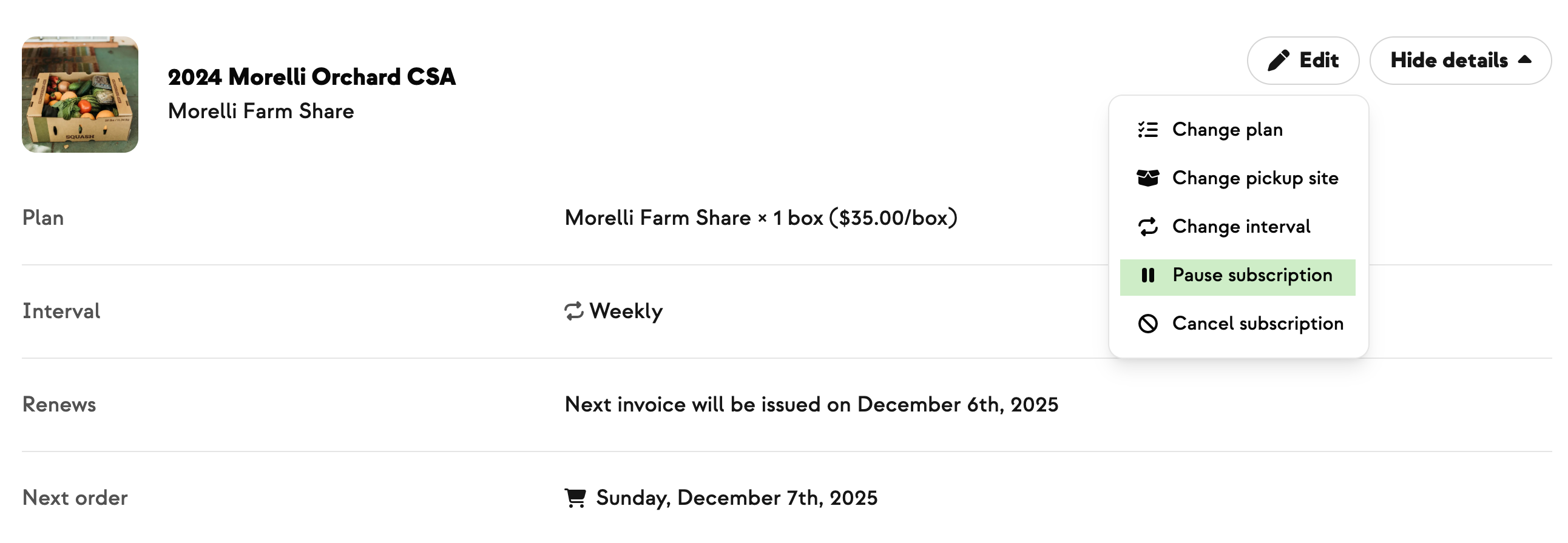 If your farm offers add-on subscriptions (like eggs, bread, or flowers), you can pause and resume them individually — without skipping your full CSA share.