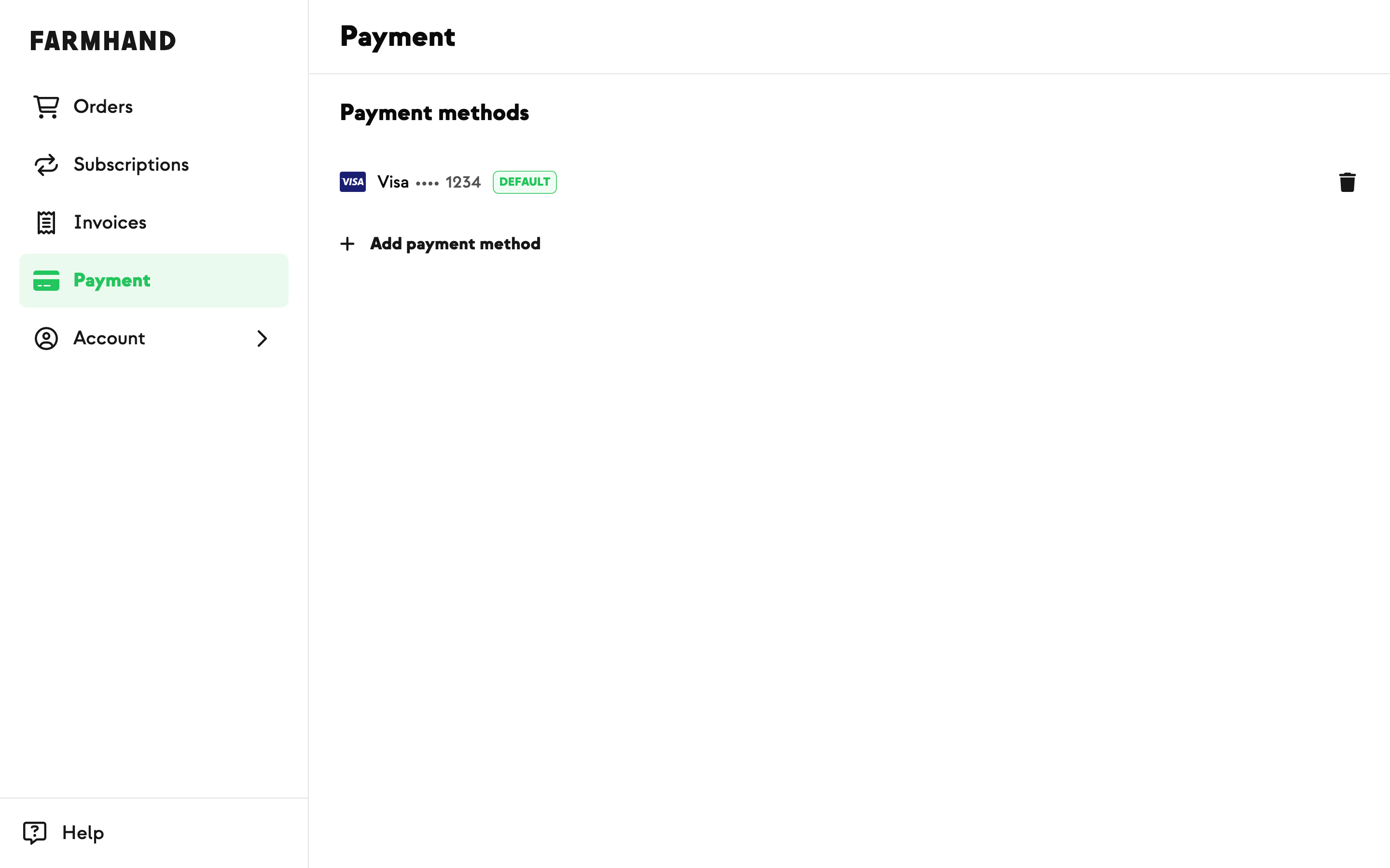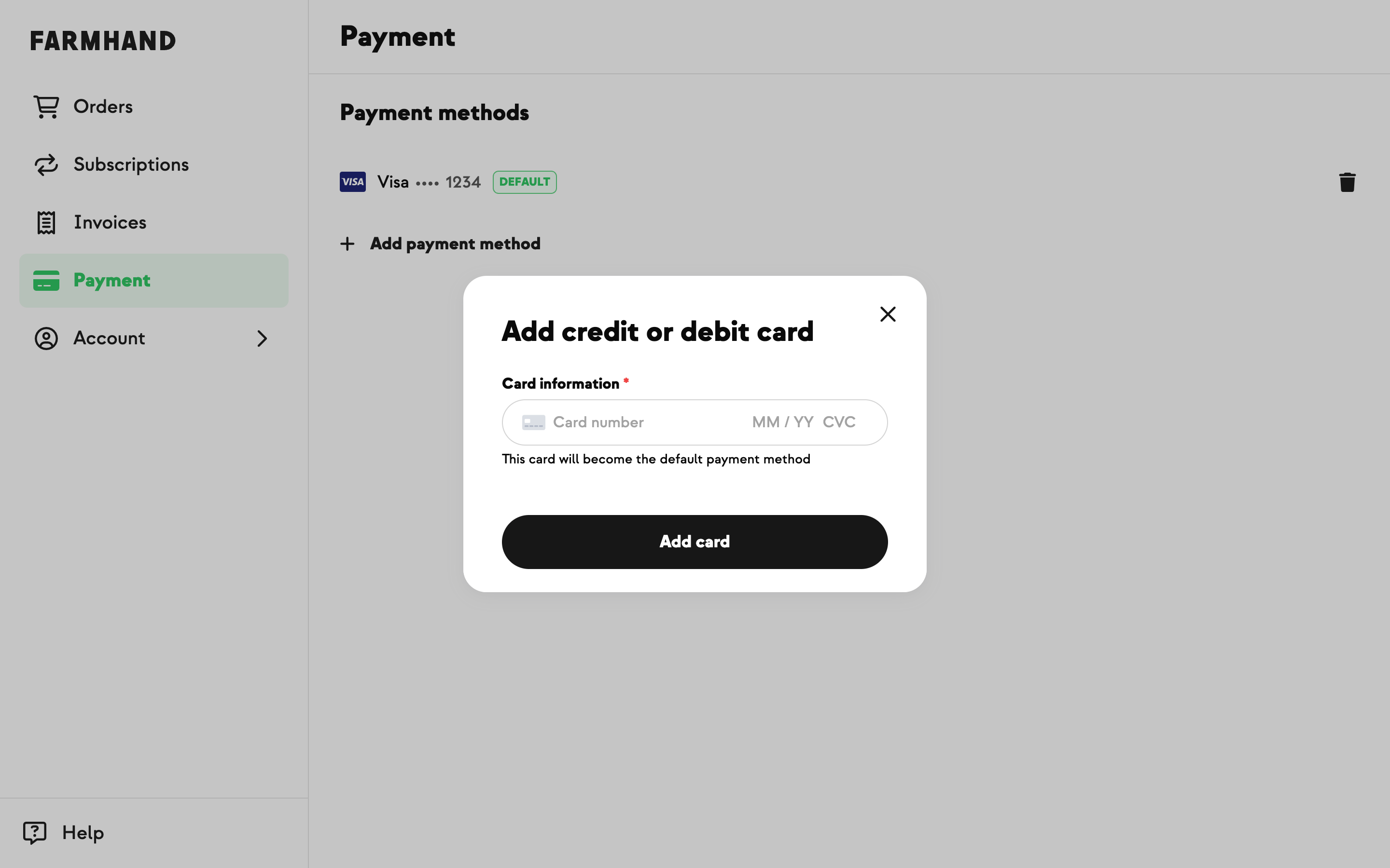 Your new card will be set as your default payment method. If you have any recent past due invoices, Farmhand will automatically attempt to pay them with your newly added card.