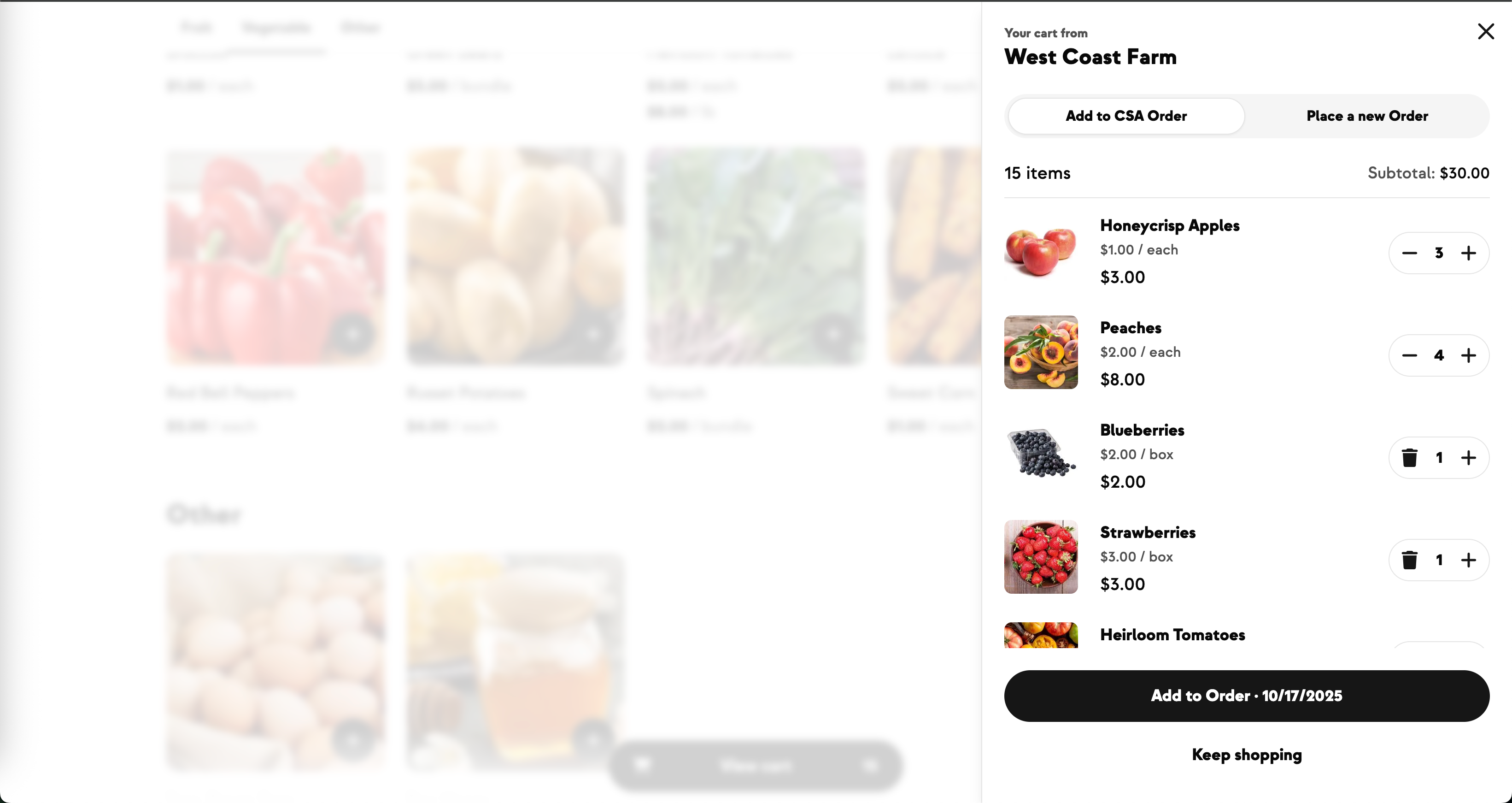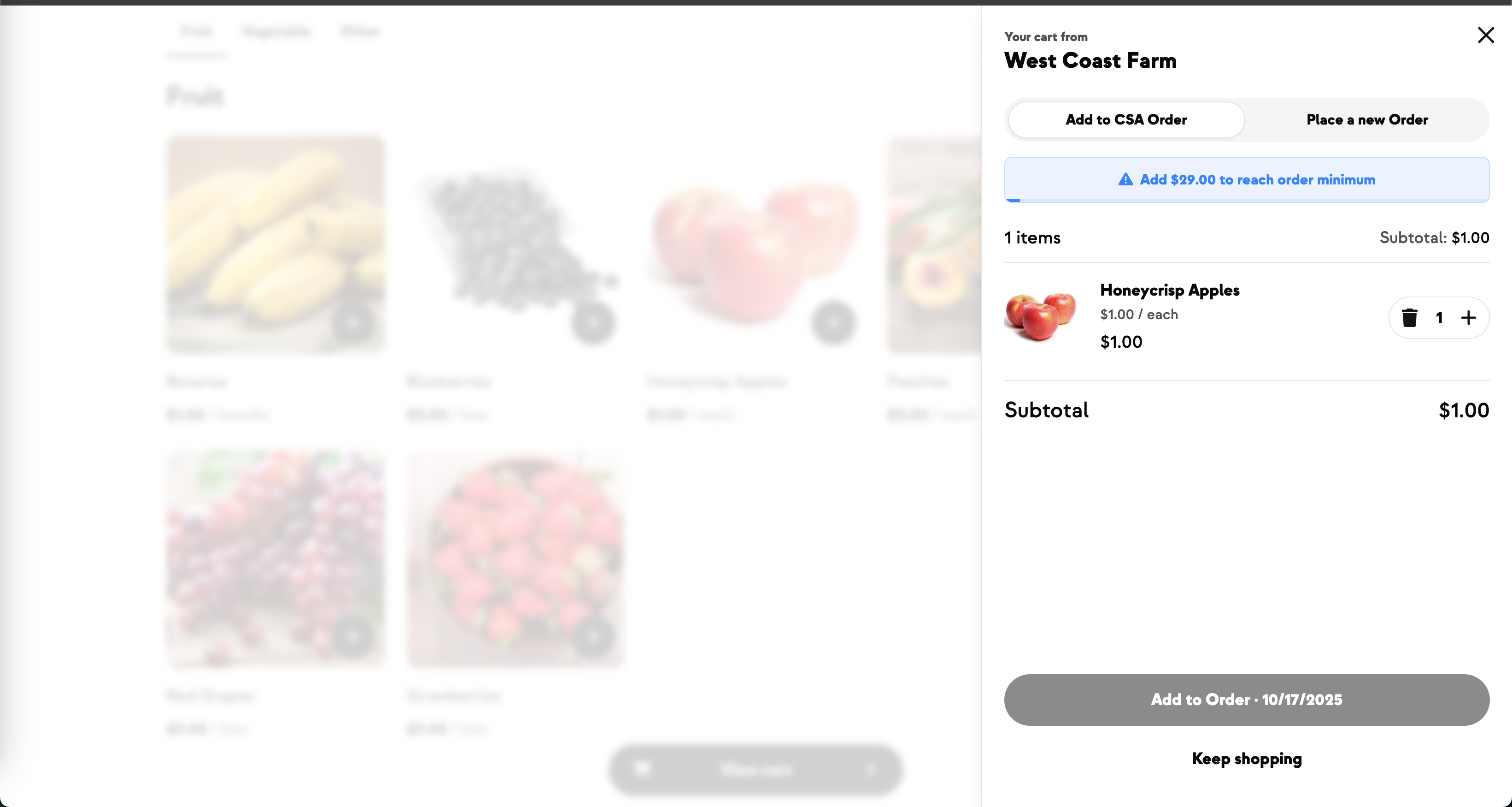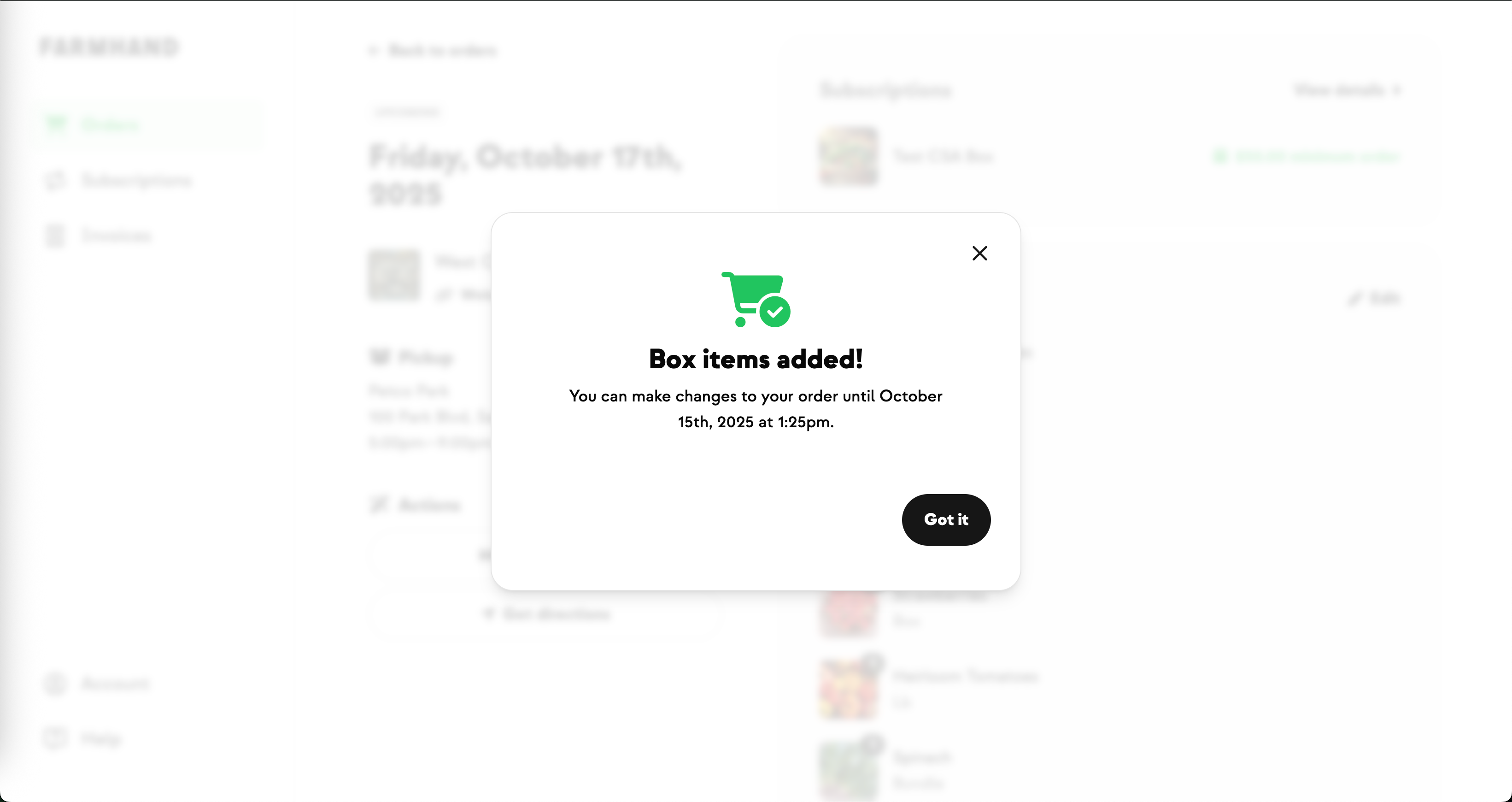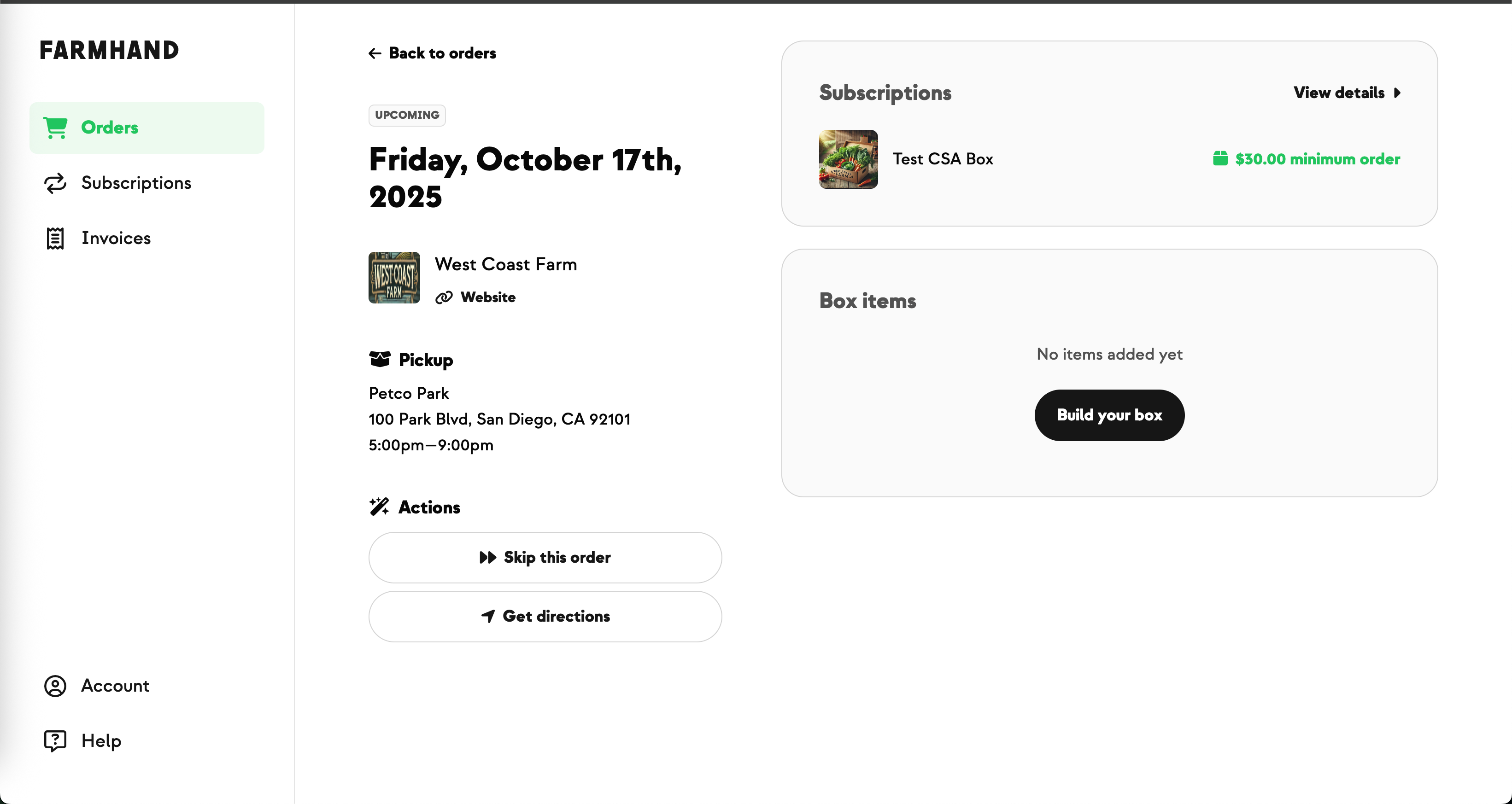 Depending on your farm's setup, if you don’t build your box by the order cutoff, you'll be enrolled in the default farmers' choice box, or your order will be auto-skipped for that week. If your box is auto-skipped, your credit stays on your account and rolls forward to future orders.
