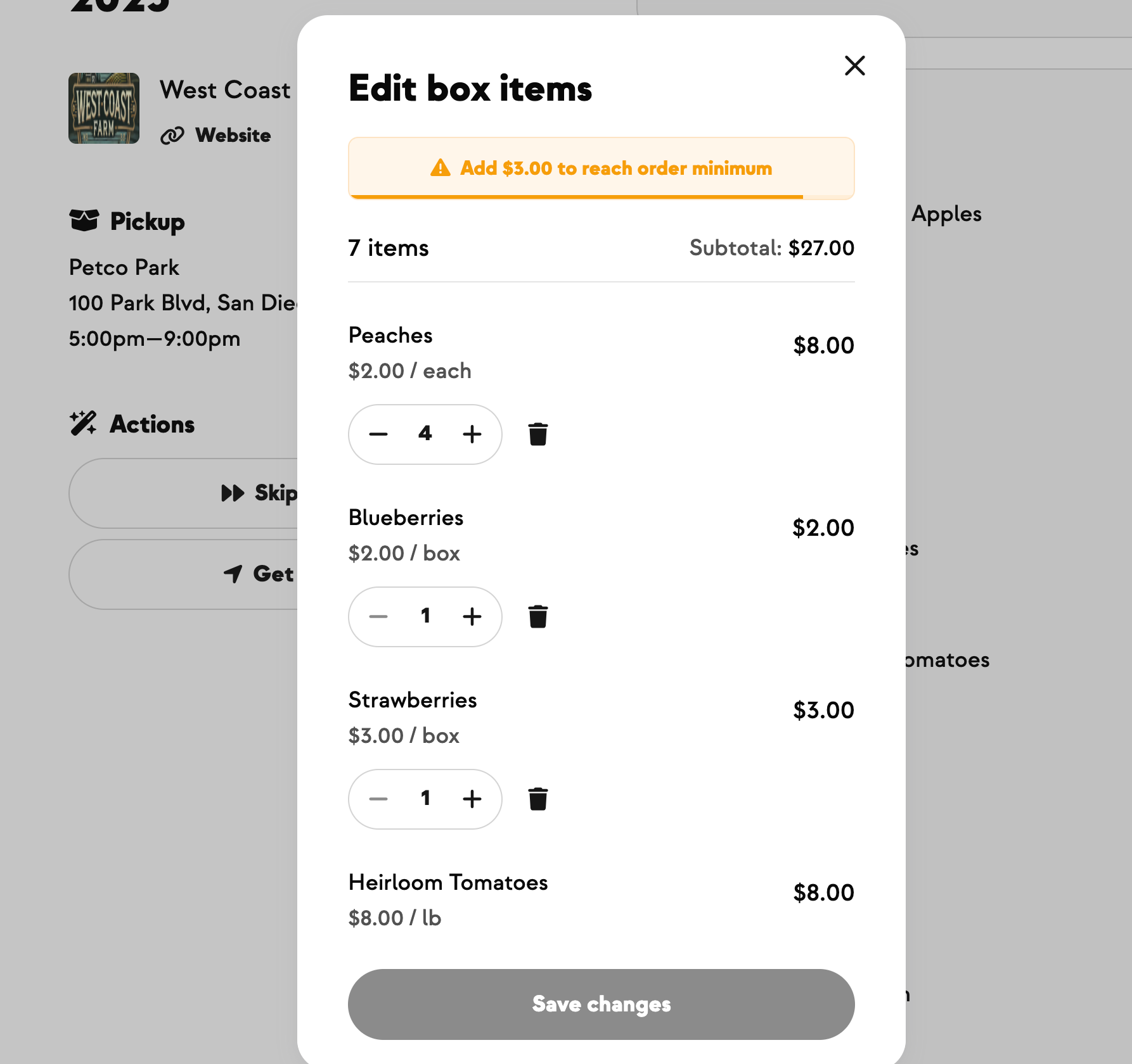 You can edit your order before the cutoff. If your edits drop your order below the minimum, a notification will appear to let you know you need to add more before you can save.