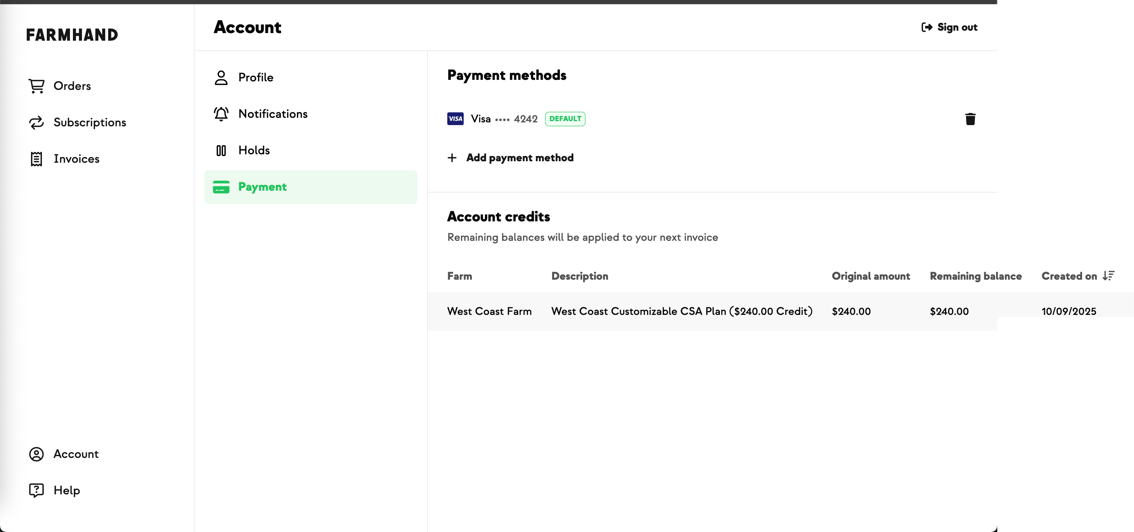 At the cutoff, your order total is automatically deducted from your credit balance. You can check your remaining balance anytime under your plan in the Subscriptions tab, or from the Payment tab.