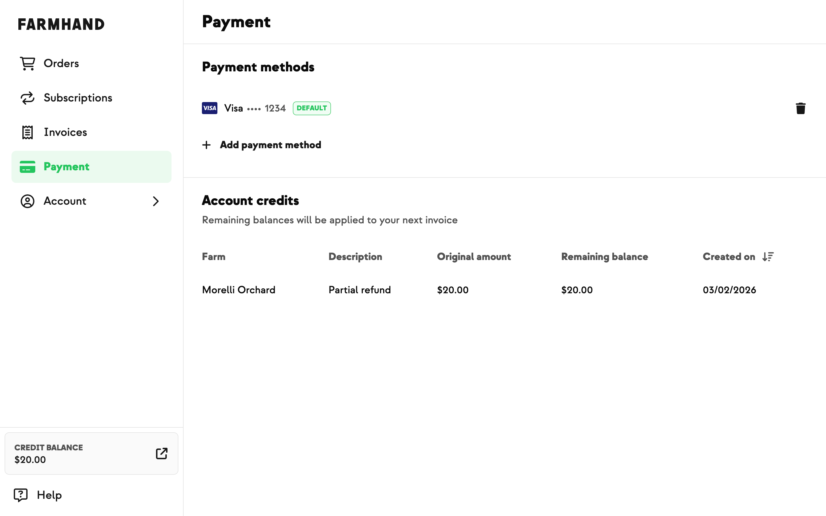 Your farm may issue credits to your account — for example, as a refund, a promotional offer, or a goodwill gesture. Credits are automatically applied to your next invoice, so there's nothing you need to do to redeem them.